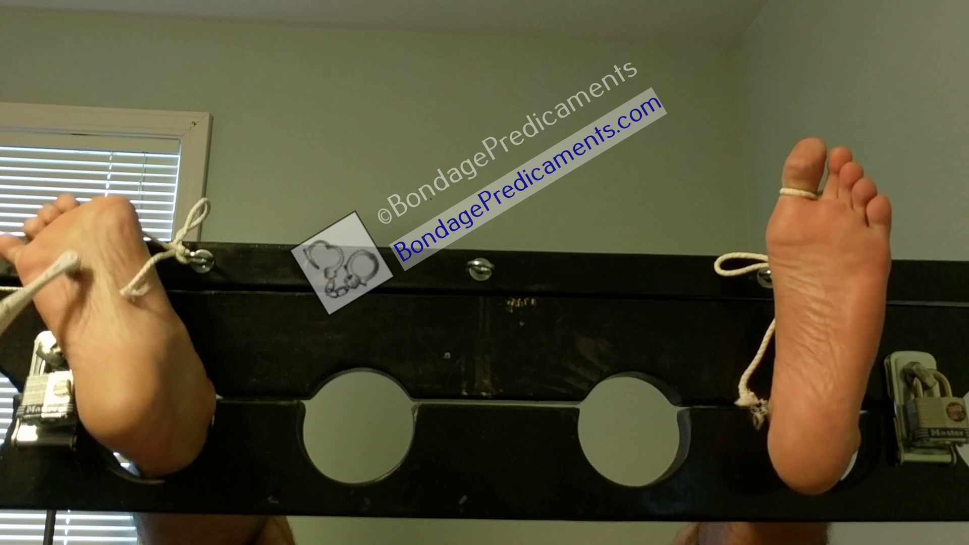 I laid this sub down on the bench suspended above the floor, then chained his wrists under the bench and locked his feet in the stocks. Since I know just how ticklish this sub is, I figured...Why waste a golden opportunity? So I took some thin rope and tied his big toes back to eyebolts in the bondage wall. Now his bare, uber-ticklish feet were exposed to whatever sadistic whims I could come up with. <evil grin!>